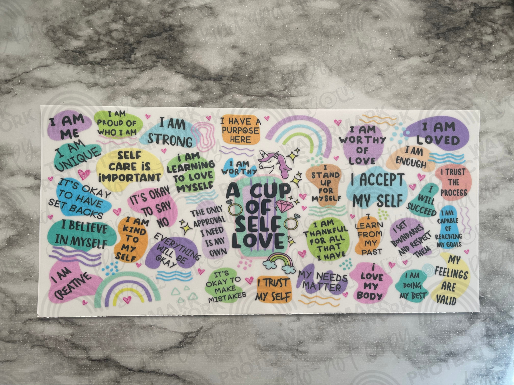 UV DTF - printed with UV cured waterproof inks directly onto adhesive, no excess media to weed. Transfer film is included and already applied. Peel cover sheet off, apply transfer, firmly press all printed areas onto the surface, push any bubbles out to the closest edge. Peel transfer film at up to 180 degrees to remove, leaving the transfer on the glass. No heat/cup press needed. Does not have to be sublimation coated, adheres to glass metal plastic and other hard substrates.